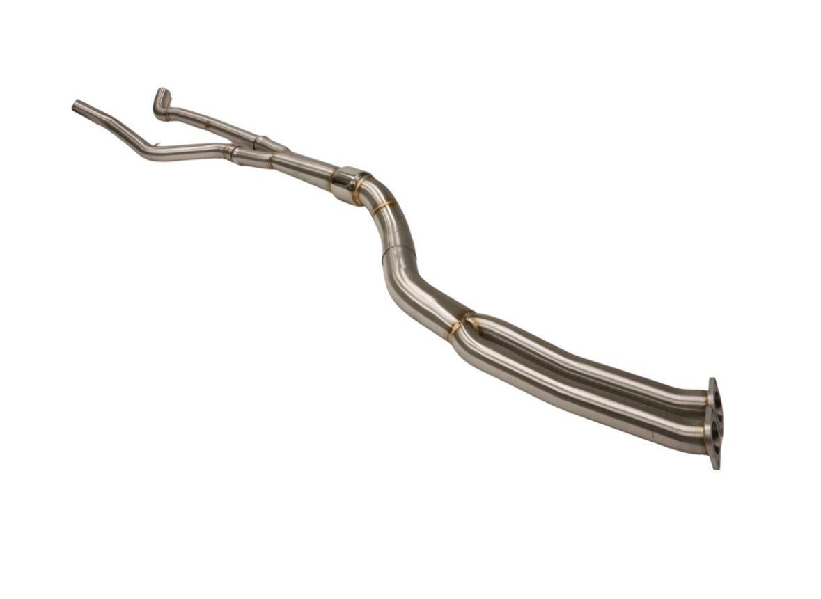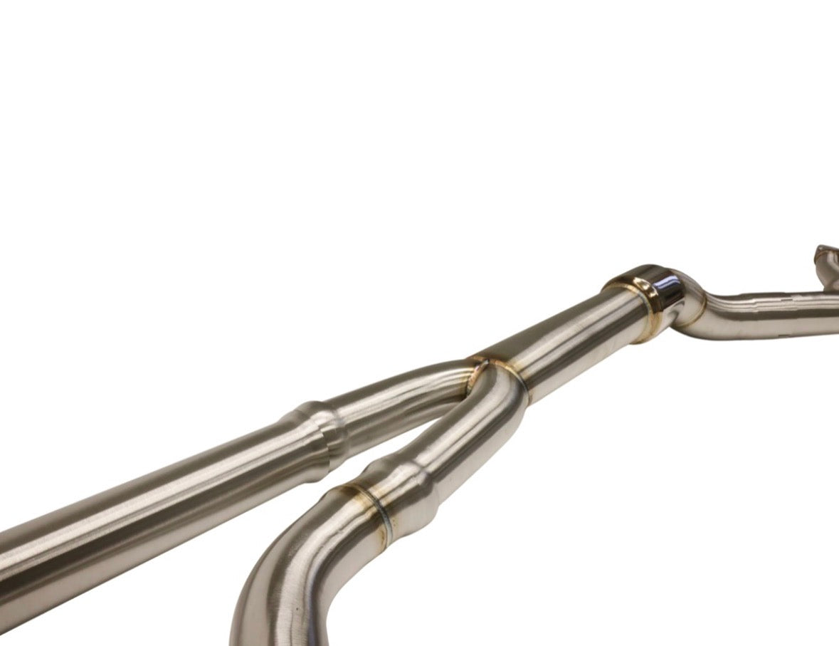 Towards the rear section of the ARM 335i 3.5" Midpipe splits back to a dual design to connect with the OEM axle-back exhaust section. By retaining the factory dual outlet layout at the rear, the ARM midpipe preserves full compatibility with the OEM axle-back and its integrated exhaust valve system. This ensures proper exhaust flow distribution, correct valve operation, and OEM-level fitment, while maintaining the performance and sound benefits of the single 3.5" midpipe design throughout the center section.