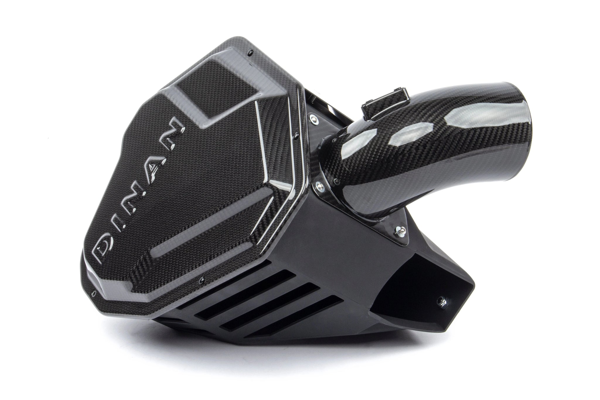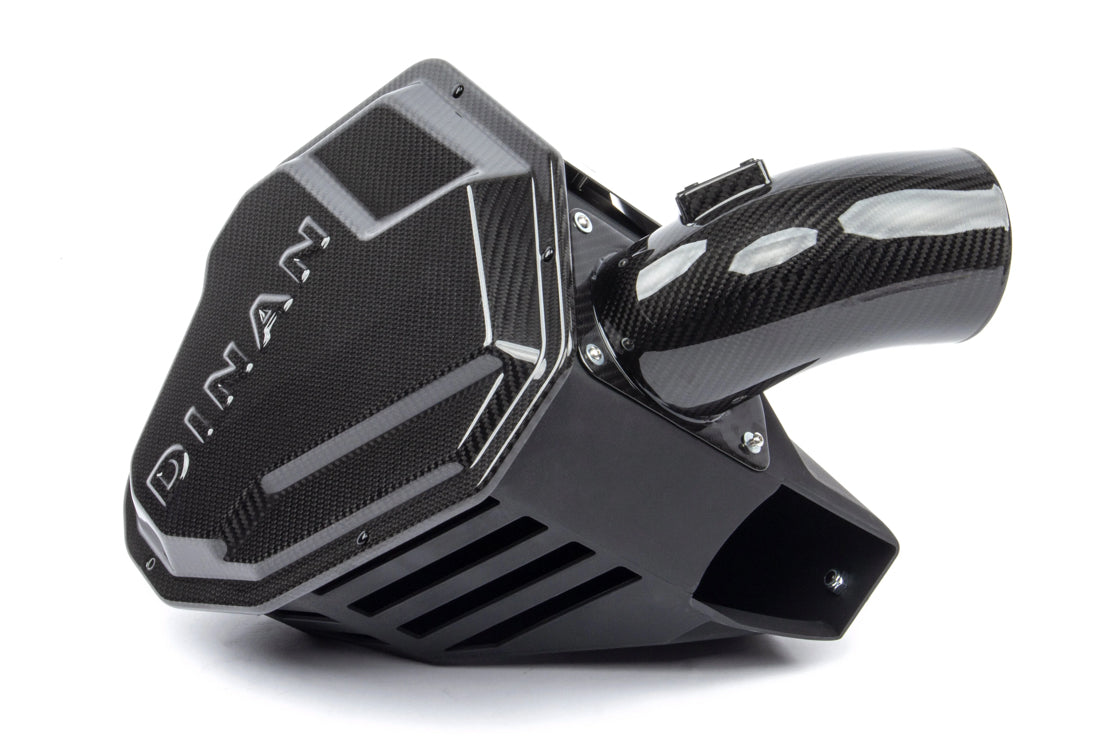 The M240i & M340i are impressive vehicles in terms of performance and style but that is not conveyed when viewing its lackluster stock intake system. In stock trim, the M240i/M340i comes with a dry and lifeless air box housing a basic panel filter that is also accompanied by an intake resonator whose job it is to eliminate turbo/intake noises. The same noises that those in the performance world relish. Essentially BMW has seen fit to give M340i owners an air box that looks uninspiring, flows adequately but not ideally, and emits no noise. The exact opposite of what the platform exudes otherwise. The Dinan carbon fiber intake for the platform rights these wrongs and delivers a semi-open intake capable of flowing 58% more air than the stock system resulting in additional top end power and increased throttle response. At the same time revealing a more aggressive, sporty carbon fiber appearance, and an increase in sound courtesy of the removal of the intake resonator and implementation of a semi-open design. In order to achieve the gains in flow that set the Dinan intake system apart, the entire lower box of the system, and not just the lid, has been reworked and enlarged in an effort to make use of as much of the available real estate as possible within the engine bay. In turn, this allows a 40% larger, custom, free flowing filter to be housed within and maximum flow to be realized. However, a secondary inlet has always been desired by Dinan in order to effectively fill the volume of the enlarged air box and increased filter surface area. This desire led to a multitude of experiments being conducted on the effectiveness of a possible open-air inlet in the system. With different shapes, locations, and sizes of openings being tested, the goal was to ensure that the added secondary inlet did not cause any unwarranted side effects such as an increase in air temps in the system. This is commonplace with open-air intake systems where overheated engine bay air is employed in the intake tract. The results of these tests showed that the patterned openings present in the final iteration of the box located on the opposite side from the engine provided a perfect balance of additional volume to assist the factory inlet all the while not causing an increase in turbo inlet temperatures. This was the case regardless of testing conditions (single/multiple gear pulls, constant speed, 0-100mph runs, etc.). With more air being pulled into the system, throttle response is improved and additional power is realized in the form of max gains of +9 WHP / +8 ft-lbs of torque. The secondary air inlets also allow the intake system to be more audible so the turbo spool and BOV can be appreciated. A stark difference from Dinan's traditional fully sealed systems where induction noise is not nearly as recognizable. Not to be outdone by the increased power and sound, the outwardly visible system is made of immaculate carbon fiber so the under the hood appeal is vastly improved over its drab and utilitarian beginnings. A worthy piece to add to an already impressive vehicle.